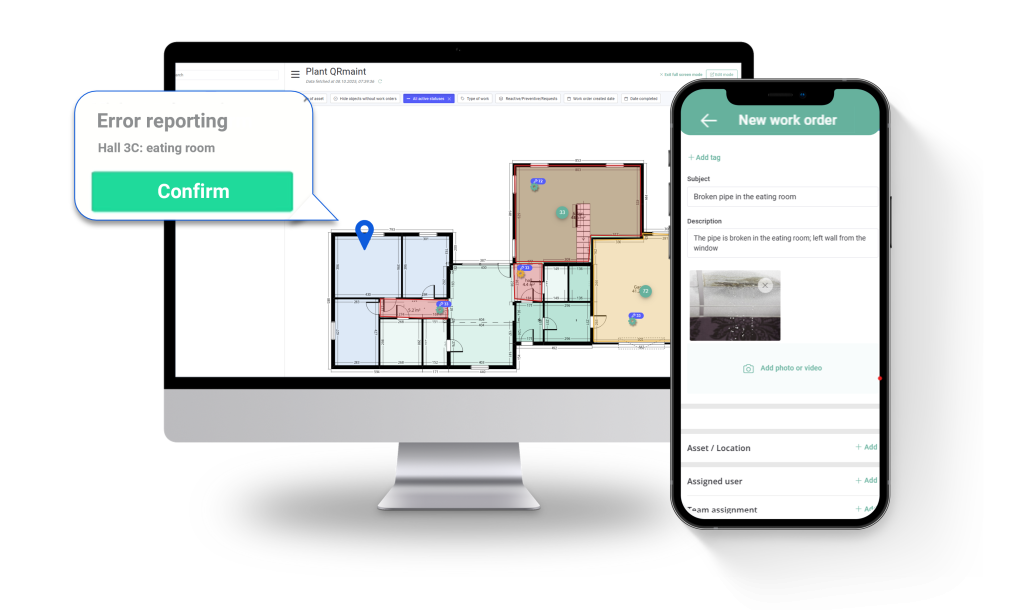 Dynamic fault reporting involves precisely pinpointing an issue on a visual representation of the asset or location. You can mark the exact location with a tag on the map in a CMMS mobile application. In fact, it is exemplified by the ability to “mark on the map”—or more accurately, to click, tap, or draw on a digital plan, floor blueprint, or technical schematic. So, whatever infrastructure map you have, it is intended to indicate the exact location of the fault.